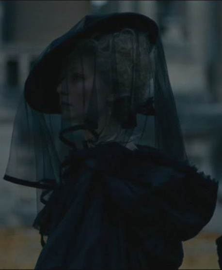 Шляпа на ней была чёрная, и со шляпы ниспадала и развевалась чёрная вуаль, тонкая, как паутина.